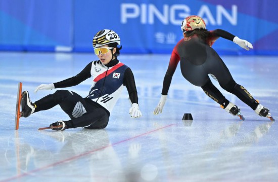 2月9日,中國(guó)隊(duì)選手林孝埈(右)、韓國(guó)隊(duì)選手樸智元在比賽中發(fā)生身體碰撞。新華社記者 顏麟蘊(yùn) 攝