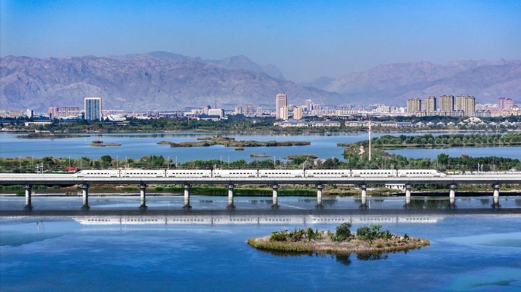 2024年10月3日,一列動(dòng)車組列車行駛在包銀高鐵惠銀段石嘴山特大橋上(無(wú)人機(jī)照片)。新華社記者馮開華攝