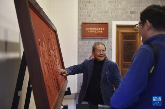 3月4日,中國(guó)工藝美術(shù)大師袁師永在自己的工作室為來訪者介紹傳統(tǒng)漆藝作品。