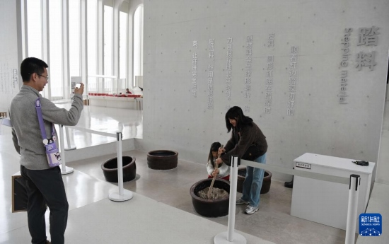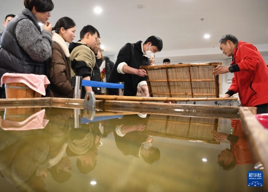 3月15日,游客在涇縣宣紙文化園體驗(yàn)宣紙?zhí)ち瞎に嚒?/p>