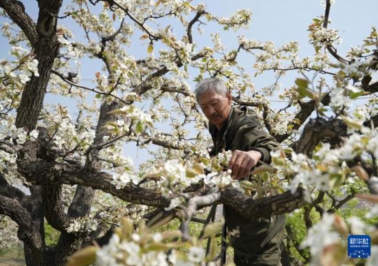 4月10日,昌黎縣兩山鄉(xiāng)正明山村的農(nóng)民在梨園疏花。