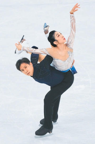 北京冬奧會(huì)上,中國花樣滑冰選手隋文靜與韓聰在比賽中。