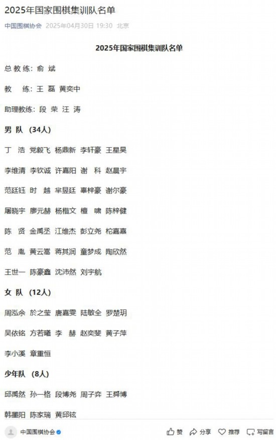 據(jù)國家圍棋集訓(xùn)隊(duì)選拔小組負(fù)責(zé)人介紹,根據(jù)《國家圍棋集訓(xùn)隊(duì)運(yùn)動(dòng)員入隊(duì)標(biāo)準(zhǔn)》,報(bào)中國圍棋協(xié)會(huì)批準(zhǔn),共有54人入選2025屆國家集訓(xùn)隊(duì)。男隊(duì)由王星昊、丁浩、黨毅飛、楊鼎新、李軒豪、李維清、李欽誠等34名棋手組成;女隊(duì)有12人,包括周泓余、於之瑩、唐嘉雯等。此外,國少隊(duì)還有8名棋手。國家圍棋集訓(xùn)隊(duì)的教練組由5人組成,俞斌擔(dān)任總教練,王磊、黃奕中擔(dān)任教練,段榮和汪濤任助理教練。