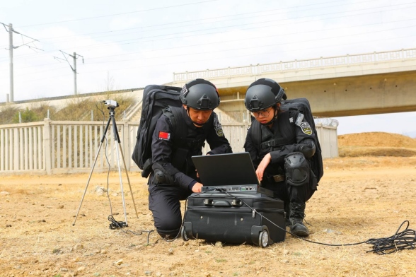 特警信息組對(duì)附近地形進(jìn)行勘測(cè) 湯彥冬 攝