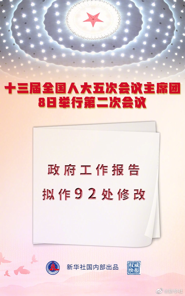 記者8日從十三屆全國人大五次會議主席團(tuán)第二次會議上獲悉,政府工作報(bào)告擬作92處修改。