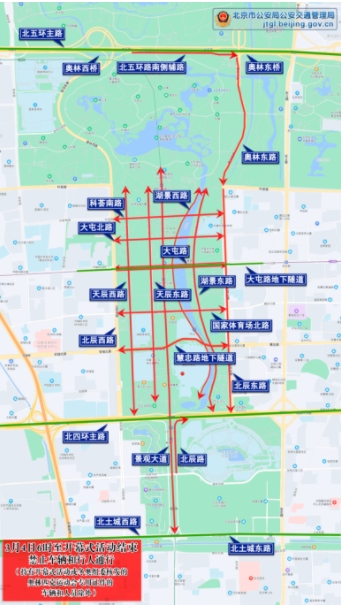 三、14時至開幕式結束,北辰西路、奧林西路、奧林東路南向北方向主輔路、北辰東路南向北方向主輔路、民族園路,除持有開幕式或冬奧組委核發(fā)的奧林匹克運動會專用證件的車輛和人員外,禁止其他車輛和行人通行。社會車輛和公交車可經(jīng)安立路、安定路、京藏高速公路、北土城西路、北土城東路繞行。
