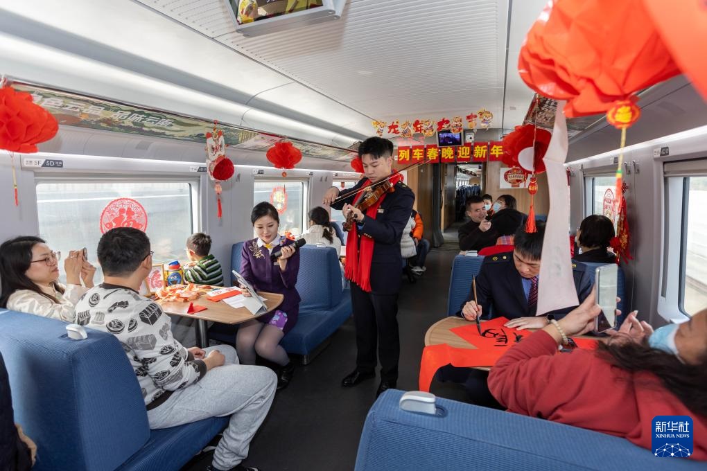 ??2月9日,在鐵路上??瓦\(yùn)段G1426次列車舉行的“列車春晚迎新年”主題活動(dòng)上,乘務(wù)員為旅客演奏小提琴。