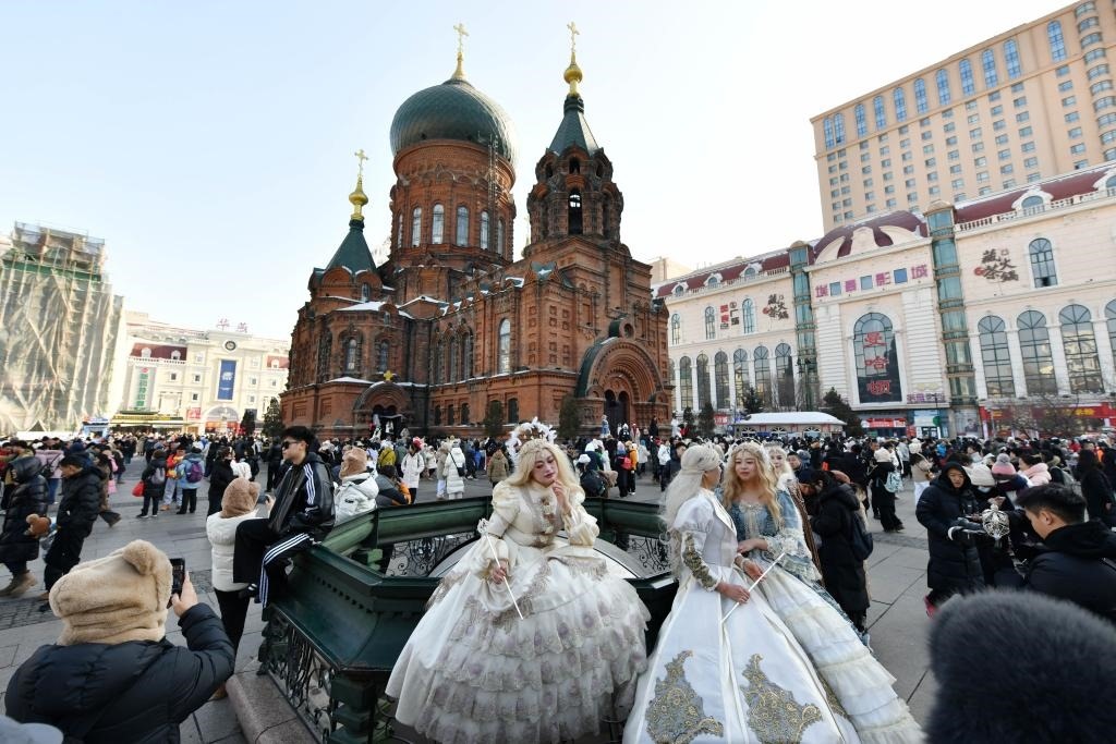 2月12日,旅拍游客在哈爾濱建筑藝術(shù)廣場(chǎng)身著盛裝拍照。(新華社記者王建威攝)