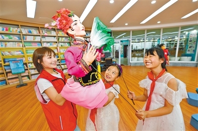 靳媛指導(dǎo)小學(xué)生學(xué)習(xí)杖頭木偶戲的操縱。