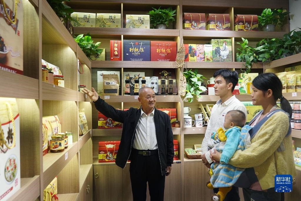 2020年10月21日,江西省贛州市于都縣梓山鎮(zhèn)潭頭村村民孫觀發(fā)(左一)向游客介紹當?shù)氐奶厣r(nóng)產(chǎn)品。 新華社記者 萬象 攝