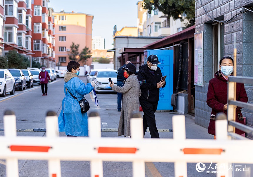 呼和浩特市玉泉區(qū)一處住宅小區(qū),社區(qū)網(wǎng)格員在查驗準(zhǔn)備去核酸檢測點居民的健康碼。丁根厚攝 -