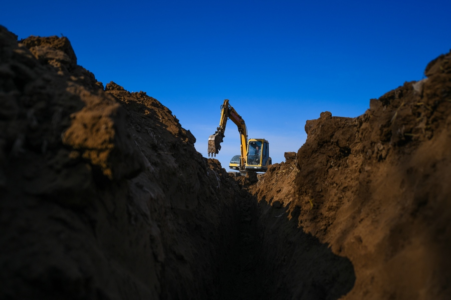 2024年,土默特左旗高標準農(nóng)田建設任務9.54萬畝,建設內(nèi)容包括土地平整、土壤改良、灌溉和排水、田間道路、農(nóng)田防護與生態(tài)環(huán)境保護、農(nóng)田輸配電等項目。圖為大型機械正在平整土地。(攝影:楊鑫) -